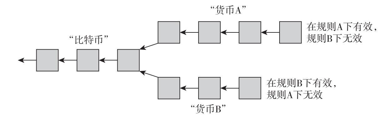 注:如果规则的分叉导致区块链的硬分叉,那么货币本身就会分叉成两种新货币。