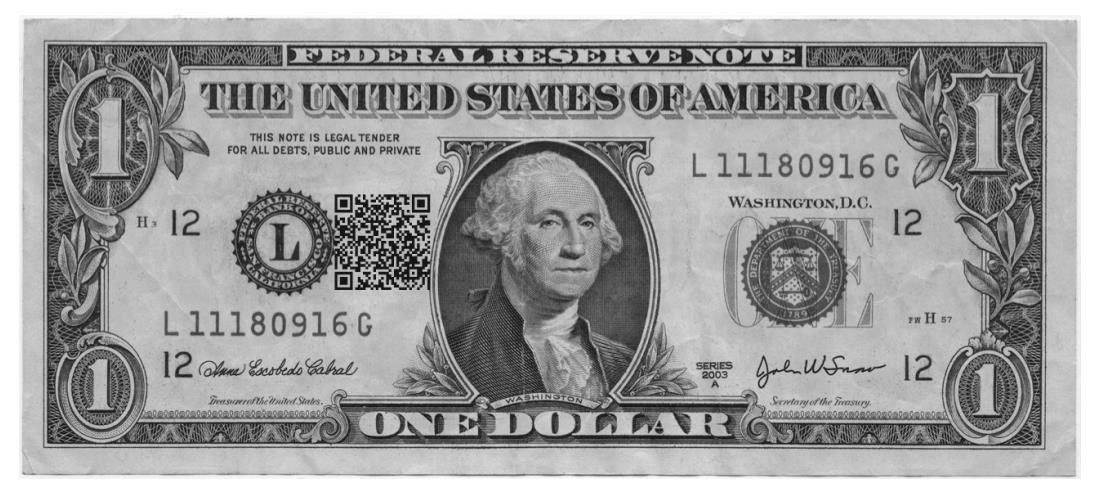 扬基队可以用数字签名来增加真实性。他们可以把特定的比赛日期、座位号及钞票的序列号一起做签名,然后把这个签名印在纸币上。通过一个简单的二维码就可以实现这个功能(如图9.3所示)。球馆可以相应地维护一个保存所有钞票序列号对应每场比赛和座位号的数据库,当你凭票入场的时候,它们只需要根据你所提供的二维码去数据库里校验即可,也就不需要在纸币上盖章并印上相关信息了。