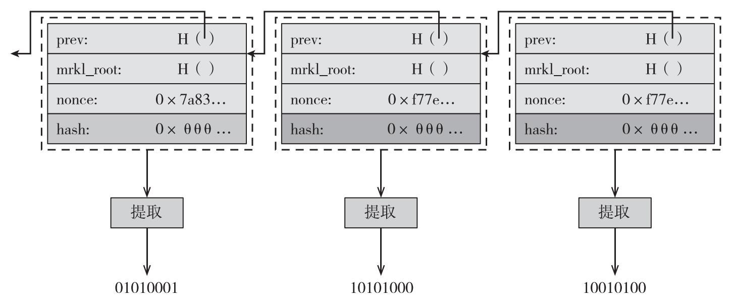 这样一来,把区块链变成一个随机数“信号塔”成了一件简单的事。在区块链上的每一个区块上,我们在区块头部设置一个“随机数抽取器”。随机数抽取器,其实就是一个哈希函数,这个哈希函数把所有的输入随机熵均匀地压缩成一个随机字符串。每次只要发表一个区块,我们就有了一个新的随机信号输出。