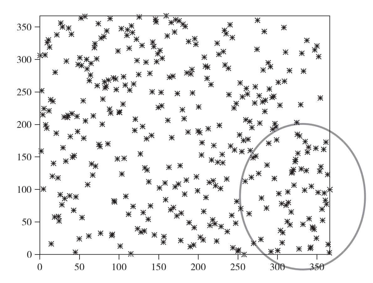 1969年的这次征兵选秀,是首次在全国范围内采用乐透方式进行选秀。其目的是通过避开数以千计的本地征兵委员会,以使选拔过程更加公平,并且向公众公开这个过程。但遗憾的是,这个选秀乐透也演砸了,不到一个星期,概率专家通过数据调查分析注意到了一个特别的模式(如图9.7所示):出生于下半年的人被选中的优先级较低。虽然这种差异非常细微,但是从概率统计上是非常显著的,说明这不太可能是偶然事件。当他们回看现场录像的时候,发现每次转动转盘的次数恰恰都是偶数次,这意味着一开始是上层的小球有较大的概率一直留在上层,说明为了形成随机抽签的混合程序并不充分。