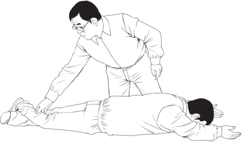 跪在患者身体的一侧,然后将其两个上肢向上伸直,将远侧的腿搭在近侧的腿上。