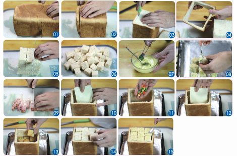 3.如图所示,用刀将吐司的内部挖出来。一定要挖整齐,周围只留下一道薄薄的吐司边。