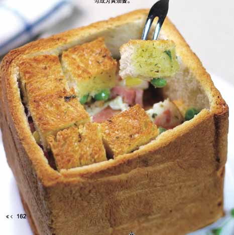 吐司1条(或市售原味吐司1条),黄油50g,干燥法香末1小勺(5ml),盐1/8小勺(0.625ml),培根4片,奶酪片3片,玉米粒、豌豆粒、胡萝卜丁各适量