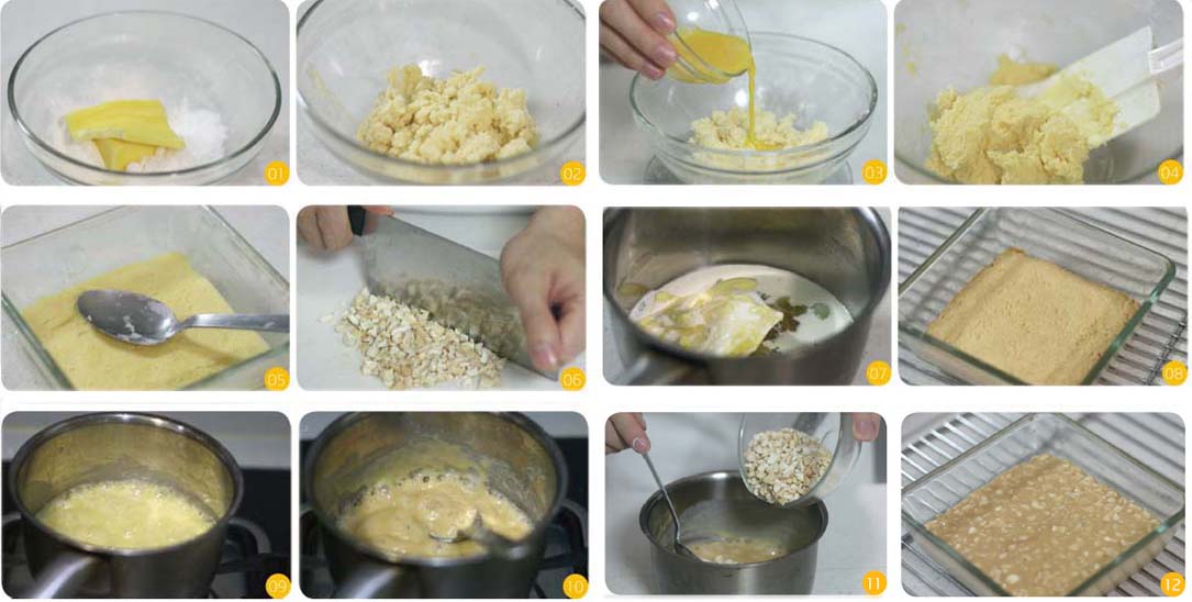 12.将蜂蜜腰果馅倒在烤好的饼底上,用勺子背压平。将烤碗重新放入烤箱中层,用175℃烤8分钟左右即可出炉。等完全冷却后,用小刀沿着烤碗内壁小心地将蜂蜜腰果酥和碗壁分开,然后将蜂蜜腰果酥倒扣出来,切成9块。