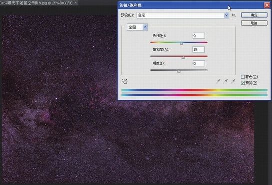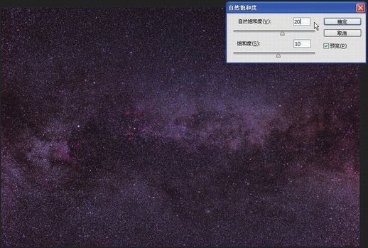 调整颜色饱和度还有一个更精细的方法,就是使用“自然饱和度”对话框。点击菜单栏“图像”-“调整”-“自然饱和度”,就可以打开该对话框,如下图所示。下方的“饱和度”与之前介绍的类似,而如果增强上方的“自然饱和度”,软件会自动分析图像,将饱和度不足的地方增强,饱和度已经很充分的地方则基本不变,这样调整出来的饱和度可能会更自然。不过,对天文照片而言,增强自然饱和度很可能意味着增加暗部的饱和度,这样噪点也会更明显,因此这两项要结合使用才会效果更好。