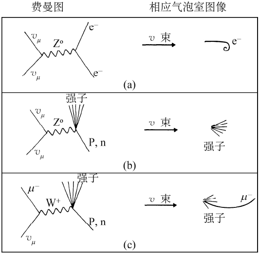 图4.21 费曼图以及气泡室图像。此图说明了运行轨迹间的对应关系。可以在室中以及过程背后的理论表述中看到运行轨迹。(a)轻子中性流。1个μ介子-中微子放射出1个Z0并散射出1个电子,在气泡室胶片中能够看到其反冲过程。因为是中性的,所以中位没有留下任何痕迹。(b)强子中性流。1个μ介子-中微子放射出1个Z0,将质子或中子分离成许多强子。(c)荷电流事件。1个μ介子-中微子放射出1个W+,由此,W+转化成1个阴性μ介子。当W+被质子或中子吸收,后者会分解为强子。