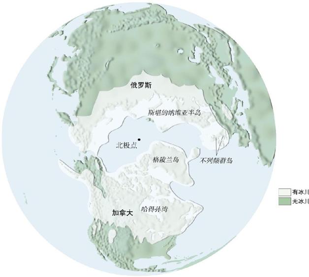 图 3.29 北半球大陆冰川的最大规模(大约1.5万年前)。由于大量水分以冰的形式保存在陆地上且冰川扩展到现今的大陆岸线以外,所以海平面比现今为低。分离的积雪中心和成冰作用发展。在北美西部山地和前进的冰川前缘之间有大湖区形成。在南部,巨大的河流排出冰川融水。