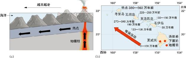 板块交汇带不仅仅是岩石圈再调整的敏感地带。当岩石圈板块发生运动时,地壳发生破裂或者破碎为成千上万的碎块。有些裂口薄弱到一定程度而成为热点(hot spot),也就是由于熔融物质上升而引起火山喷发的地区。熔融物质可能从火山中喷发而出,或者从裂口中涌出。稍后我们在讨论地球构造力时还将回到火山活动上来。