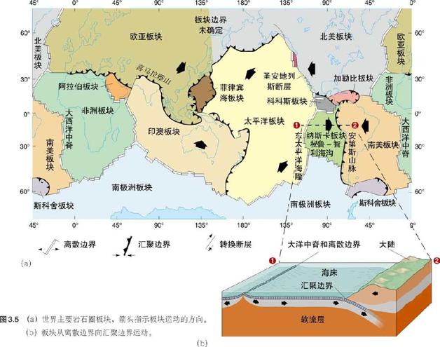 图 3.5 (a)世界主要岩石圈板块,箭头指示板块运动的方向。(b)板块从离散边界向汇聚边界运动。
