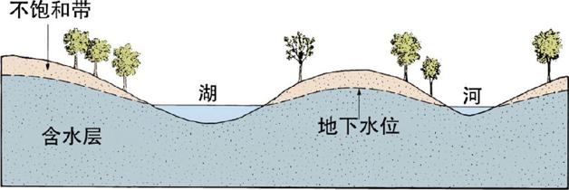 图 3.26 地下水位一般随地表等高线起伏,但是起伏较和缓。地下水缓慢地通过被水饱和的岩石,在低于地下水面的地表洼地中出露。在干旱时期,地下水位降低,河床变干。