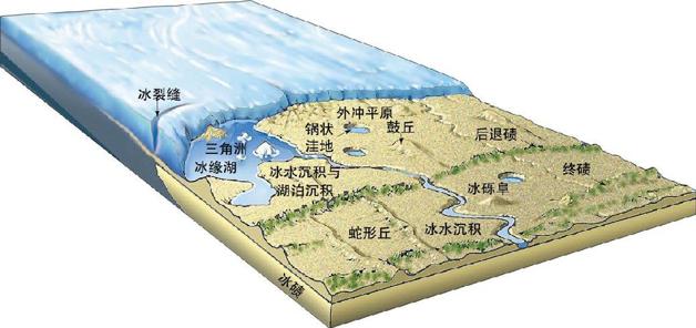 图 3.31 由冰盾形成的堆积地貌特征。大陆冰川所携带的碎屑物质在冰川后退时堆积下来形成各种地貌。冰碛是在冰川后退边缘形成的无分类的冰川堆积。外冲平原由河流搬运的冰砾物形成。冰砾阜是冰水沉积物形成的圆锥状小丘。鼓丘是冰碛物构成的长条形丘,指示冰川运动的方向。蛇形丘是冰川融水的沉积物所构成的长条丘脊。锅状洼地是由停滞的冰块融化形成的封闭洼地,为沉积物所掩盖,周边为沉积物环绕。