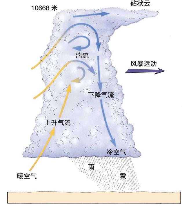 图 4.12 对流系统。下降的冷空气流向低压处。降水最常发生在低压带,当暖空气上升时,空气变冷,并且空气的水分变得过饱和,形成降水。
