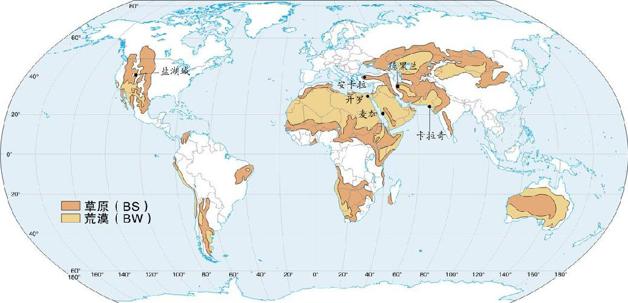 图4.38显示了这类气候的位置。在有山地阻挡西风的大陆内部,或者远离热带潮湿空气到达范围的陆地,会出现广大的荒漠和半荒漠环境。