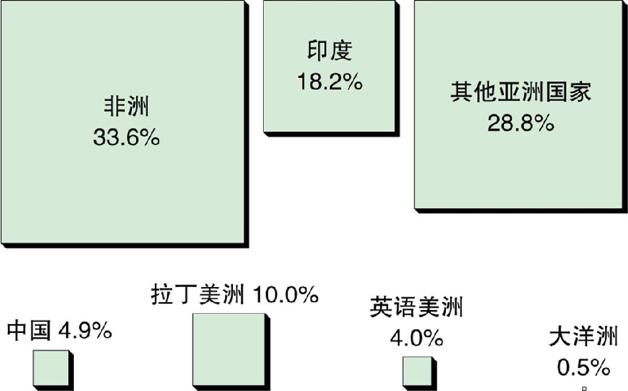 图 6.4 2000—2050年按地区统计预测的世界人口增长百分比。按不同年龄结构记录的大小不等的地区人口出生率变化,正在改变世界人口增长的格局。2000年占世界人口13%的非洲,到2050年很可能增加到世界人口的1/3。1965—1975年,中国对世界人口的贡献是非洲的2.5倍;2000—2050年,非洲增长的数目将比中国大7倍以上。印度在2000年达到10亿人口的水平,预计到21世纪上半叶将增加50%,在世界人口上遥遥领先。按联合国2002年的人口预测,与世界各地区的增长相反,同一时期欧洲人口预期将减少9000万。