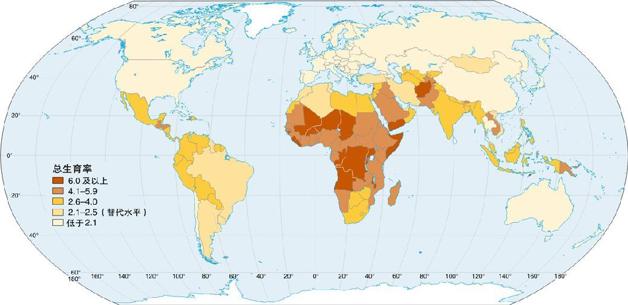 尽管生育率总体上呈现实质性趋同,但是发展中世界仍有相当重要的少数国家保持着替代水平1.5—2倍以上的平均出生率。的确,21世纪初几乎有14亿人还生活在总生育率3.5以上(当然,在20世纪50年代这种水平并不算高,那时只有1/4的世界人口总出生率低于这个数字)的国家或地区。目前这种总出生率高的国家和地区,在极大程度上位于撒哈拉以南的非洲、南亚中部和中东(图6.5)。联合国人口学家预测,至少在2050年以前,总出生率高的地区将是世界人口增长的主力。