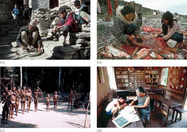 图 7.9 一切社会都把儿童培养为该文化群体的成员。照片中每个场景里的人都在把某种价值观、信仰、技艺和得体的举止方式传授给年轻人。([a ]© Cary Wolinsky / Stock Boston; [b ]© John Eastcott / Momatiuk / The-Image Works; [c ]© Yigol Pardo / Hillstrom Stock Photo; [d ]© Stephanie Maze / Corbis Images )