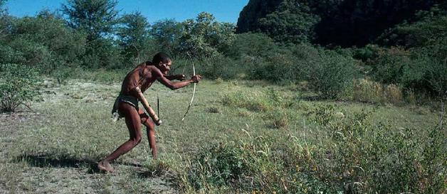 图 7.10 猎采是人类历史上持续时间最长的生活方式,随着人口增长,人们需要更多和较单一的食物,从而使生活方式转变为更艰苦的农民生活。不同于与其相对的定居农民及其后代,猎采者的人际关系和劳动分工的首要基础,无论过去还是现在都是年龄和性别的差异而不是社会地位或经济地位的不同。照片中的博茨瓦纳桑族(布须曼人)猎人是非洲至全世界迄今仍至少部分地延续这种古老生活方式的一个很小族群中的一员。(© Aubrey Lang / Valan Photos )