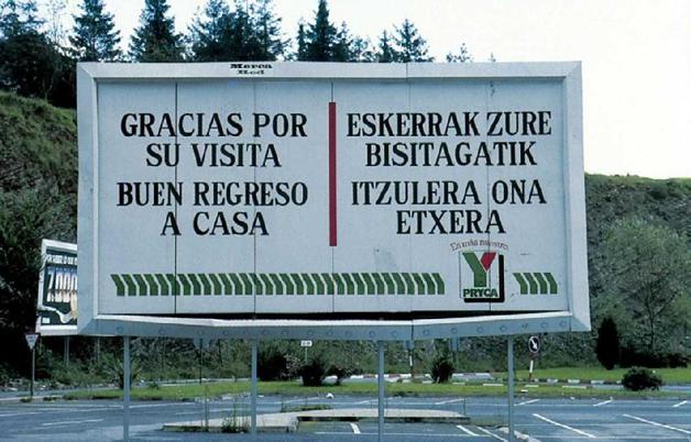 图 7.17 巴斯克人(Basque)的故乡群山环绕,虽然2000多年来被周围低地说拉丁语或罗马语的人包围,但巴斯克人保持了其语言的独特性。照片中是西班牙语和巴斯克语友好道别的表示。(© Mark Antman / Image Works )