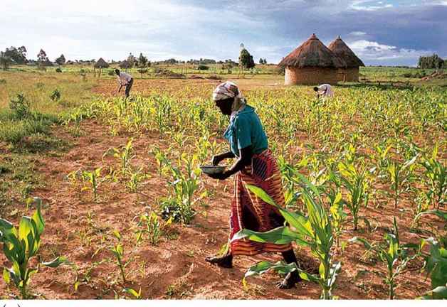 图 7.1 明显的文化差异。(a)津巴布韦自给性玉米地;(b)美国中西部广阔的田地和机械化耕作。