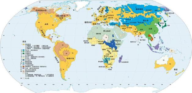 图 7.19 世界语系。语系是具有共同的、但年代久远的先人独特语言的群组。图中通过划定专门使用一种语言或一个语系的地区,省略了重要的语言细节。许多国家或地区都有一些区域使用方言,这些区域太小,不能按此比例表示在图上。图上也未能报道许多地区能流利使用不止一种语言的人口,或者在商务、教育或政府中必须用第二种语言作为媒介的情况,也没有给出说不同语言人数的重要信息,在这种比例尺的地图中甚至没有表示出印度或非洲说英语的人数多于澳大利亚的事实。