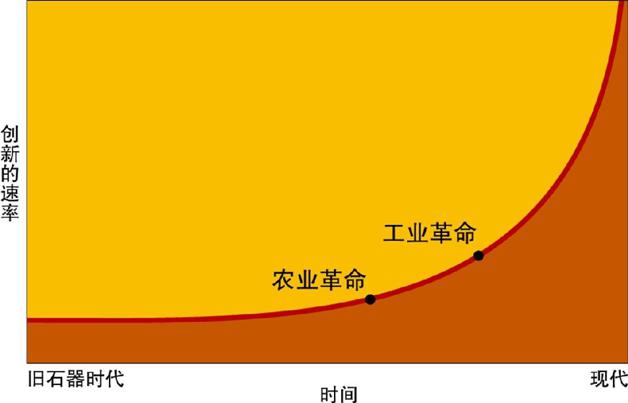 图 7.14 人类历史上创新的趋势。猎采者的生活与其环境和资源基础达到平衡,几乎没有创新的需要,其文化也无须改变。农业革命加速了思想和动植物驯化、城市化与贸易的扩散。随着工业革命,社会经济全方位创新的大幅增加开始改变世界各地的文化。