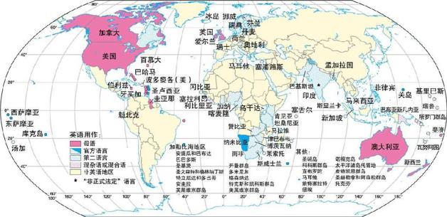 由于英国殖民者把英语带到西半球和澳大利亚,又由于贸易、占领和领土要求把英语带到非洲和亚洲,所以英语得以在全世界传播。在这种地域传播过程中,英语又因接触其他语言而更加丰富。由于英语逐步成为商业和科学研究普遍采用的语言,它又以通用词汇反哺其他语言。在大约400年内,英语已经从欧洲海外700万岛民的地方性语言发展为一种真正的国际语言——成为大约4亿人的母语,大约有6亿人将其作为第二语言,有时还是国家的官方语言,还有数百万人能较熟练地把英语作为外语使用。大约有60个国家把英语作为官方语言(图7.21),远远超过当今其他主要的国际语言,如法语(32国)、阿拉伯语(25国)或西班牙语(21国)。21世纪初,78%以上的互联网网页使用英语(其次为日语,占2.5%)。历史上没有哪种语言能在世界舞台上占据如此重要的地位。
