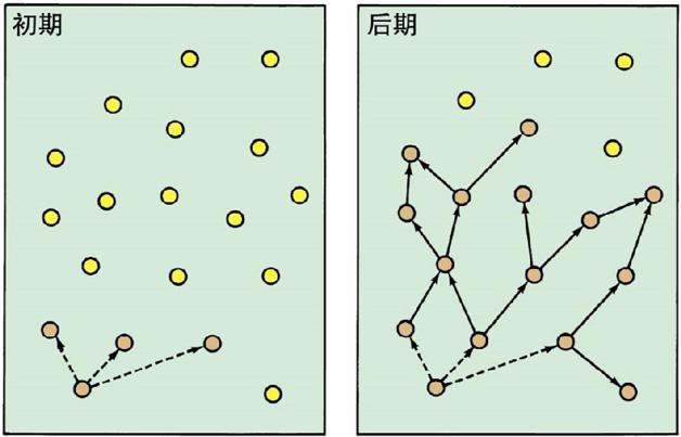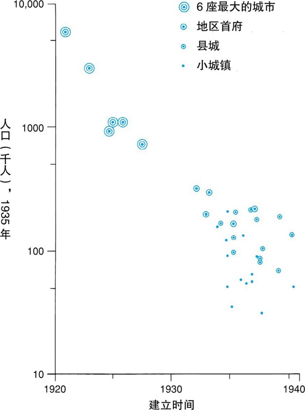 图 8.13 作为国际服务性社团组织成员的扶轮社,是在20世纪20年代的日本大城市中建立起来的。在创始机构赞助下建立了新分支机构。本图展示了等级扩散和传染扩散两种格局。