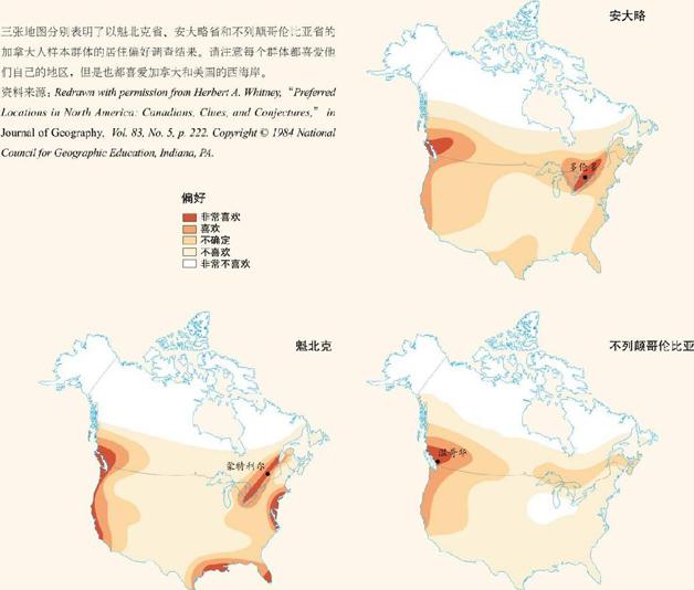 三张地图分别表明了以魁北克省、安大略省和不列颠哥伦比亚省的加拿大人为样本群体的居住偏好调查结果。请注意每个群体都喜爱他们自己的地区,但是也都喜爱加拿大和美国的西海岸。资料来源:Redrawn with permission from Herbert A. Whitney, “Preferred Locations in North America: Canadians, Clues, and Conjectures, ” in Journal of Geography, Vol. 83, No. 5, p. 222. Copyright © 1984 National Council for Geographic Education, Indiana, PA.
