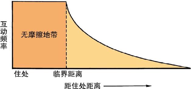 图 8.2 本示意图表明多数人是如何看待距离的。对每项活动而言,都有一个超越之后接触强度就会降低的距离,这就是临界距离。临界距离之内是无摩擦力地带,在该距离内对时间或距离的考虑对出行没有实际影响。