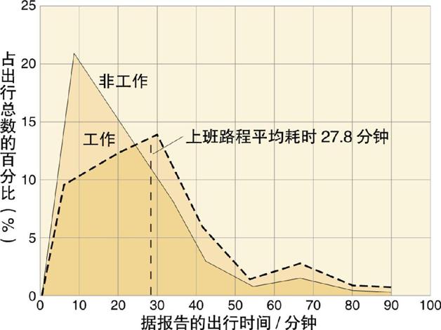 图 8.7 多伦多人工作出行和非工作出行耗时长度(以分钟计)的频率分布。对各大都市地区进行研究的成果支持本图所证明的结论:工作出行所花的时间通常多于其他目的的出行。20世纪90年代初期,美国人平均工作出行距离为17.1千米,一半人上班工作路程耗时不超过22分钟;住在郊区的人到中心商务区工作,通勤时间为30—45分钟。到2000年,城市不断向外蔓延加大了通勤的距离,同时由于交通拥堵日甚一日,使通勤时间平均增加25分钟,15%的上班族通勤时间超过45分钟。其他地方情况与此类似。20世纪90年代中期,英国人平均通勤距离为12.5千米。研究中的国家非工作出行距离都比较短。