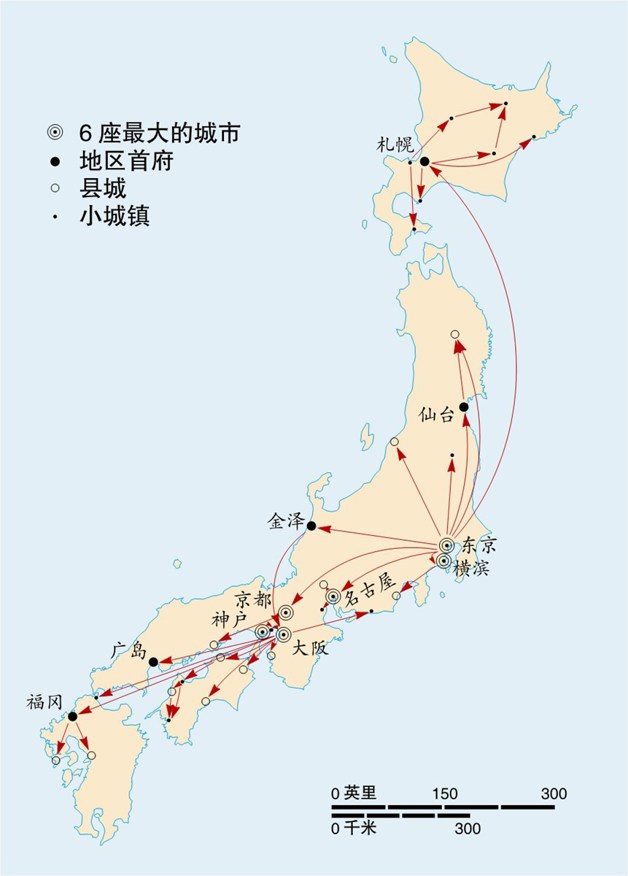 图 8.14 本图展示了扶轮社在日本传播的等级扩散的组成部分。一些大城市是扶轮社活动的一级中心,下面是城市人口与城市功能逐级降低的等级。