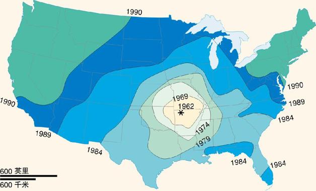 资料来源:Reproduced by permission from Resource Publications for College Geography, Spatial Diffusion, by Peter R. Gould, page 4. Association of American Geographers, 1969.