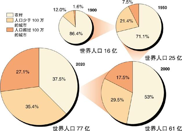 图 11.2 世界城市化趋势。请注意生活在农村地区的人口所占比例在稳步下降。联合国预测,2000—2020年间全部的人口增长几乎都将集中在世界上的城市地区。