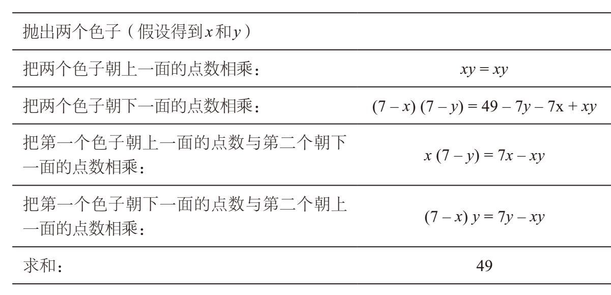 请注意,在第三步我们应用了FOIL法则(还请注意,–x乘以–y得到正的xy)。换一个代数运算较少的方法,最终也能得出49。观察每一步,就会发现上述各个等式的左边正好是利用FOIL法则展开[x + (7 – x)][y + (7 – y)]后得到的4项。