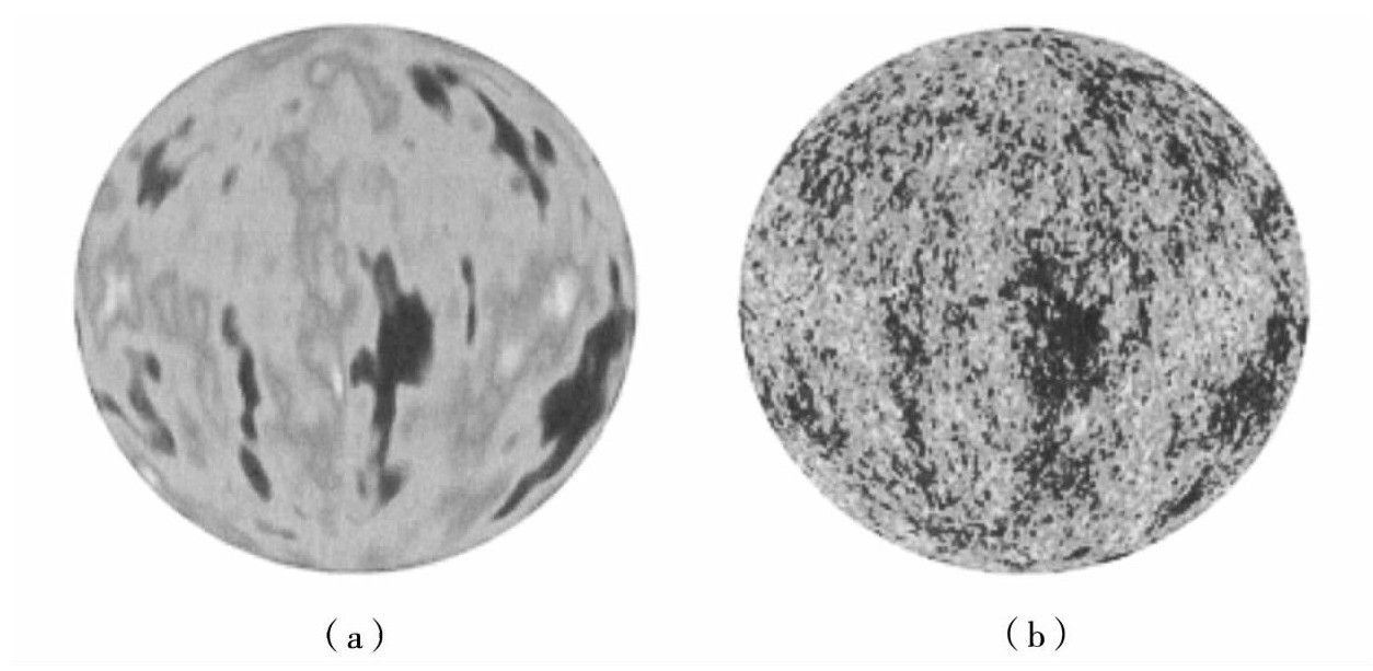 最早测得的宇宙微波背景辐射在温度上呈现出明显的均匀性。但正如我们在第11章中讨论过的那样,晚近的一些探测——最早的宇宙背景探测器(COBE)以及稍后的一系列更先进的探测器所做的一些探测——发现了一些温度细微改变的证据,如图14.4(a)所示。图中,不同的灰度标示着不同的数据,较亮的部分和较暗的部分之间的温度差一般在万分之几度左右;那些斑点表示的是天际中微小但却不可忽略的温度变化。