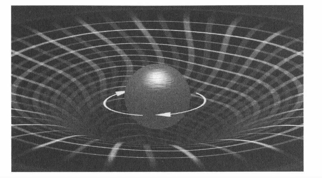 图14.1 有质量的旋转物体会拖曳其周围的空间——可以随便放入任何东西的框架。