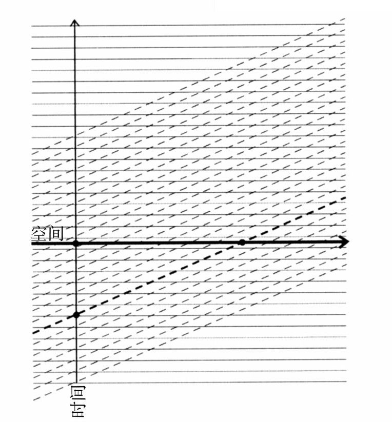 9.数学功底不错的读者将会发现,如果我们通过选择单位,使光速取每单位时间走单位距离的形式(如每年1光年,每秒1光秒,其中1光年约6万亿英里,1光秒约186000英里),那么光将以45度的光线穿越时空(因为这样的对角线满足单位时间内走单位空间,两个时间单位内走两个空间单位,等等)。因为没有物体能够超越光速,所以任何物体在某一时间段走过空间不可能比光更多,因此该物体穿越时空的路径一定与图的中心线(该线起于面包皮,穿越了面包的中心,最后止于面包皮)呈一定角度,并且该角度要小于45度。而且,爱因斯坦指出,以速度u运动的观测者的时间片——该观测者处于某一时刻时的全部空间——都符合一个方程为简易起见,假设只有一个空间维度t运动=γ[t静止-(υ/c2)x静止],其中,γ=(1-υ2/c2)-1/2,c表示光速。当单位c=1时,u<1,因此对于运动的观测者的时间片而言——t运动取定值的位置——(t静止-υx静止)=定值。这样的时间片与静止的时间片(t静止=定值的位置)之间存在一定角度,因为u<1,所以它们之间的角度小于45度。