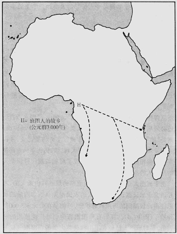 图19.4 公元前3000年至公元500年之间说班图语的人扩张时行经的大致路线,由现今班图地区西北角的故乡(用H标出)出发,扩张到非洲的东部和南部。