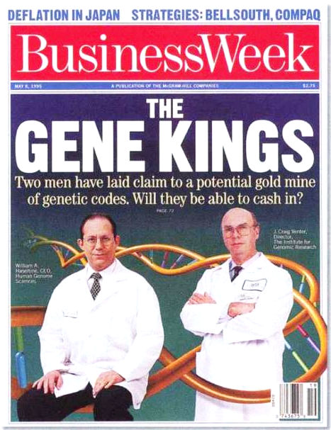 基因组计划朝商业发展:1995年5月美国《商业周刊》以黑索廷(左)及温特为封面人物,称他们为“基因之王”。
