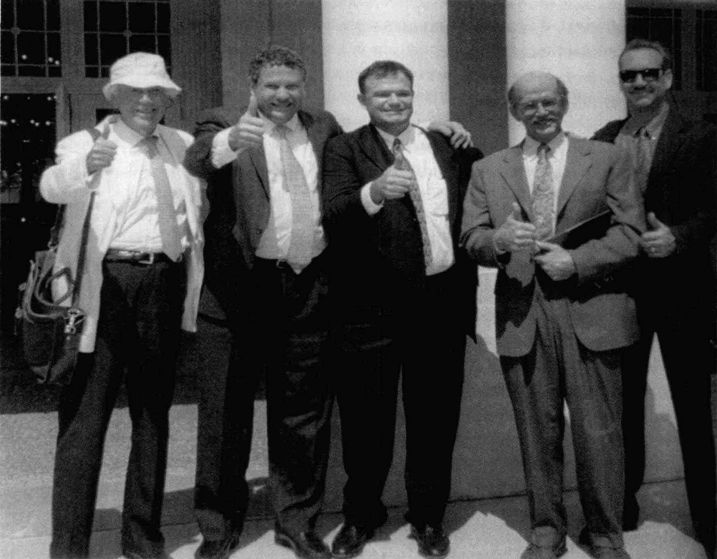 在白宫外:(左起)沃森、兰德(麻省理工怀特海德研究所)、吉布斯(Richard Gibbs,休斯敦贝勒医学院)、瓦特斯顿(圣路易华盛顿大学)和威尔逊(圣路易华盛顿大学)合影。