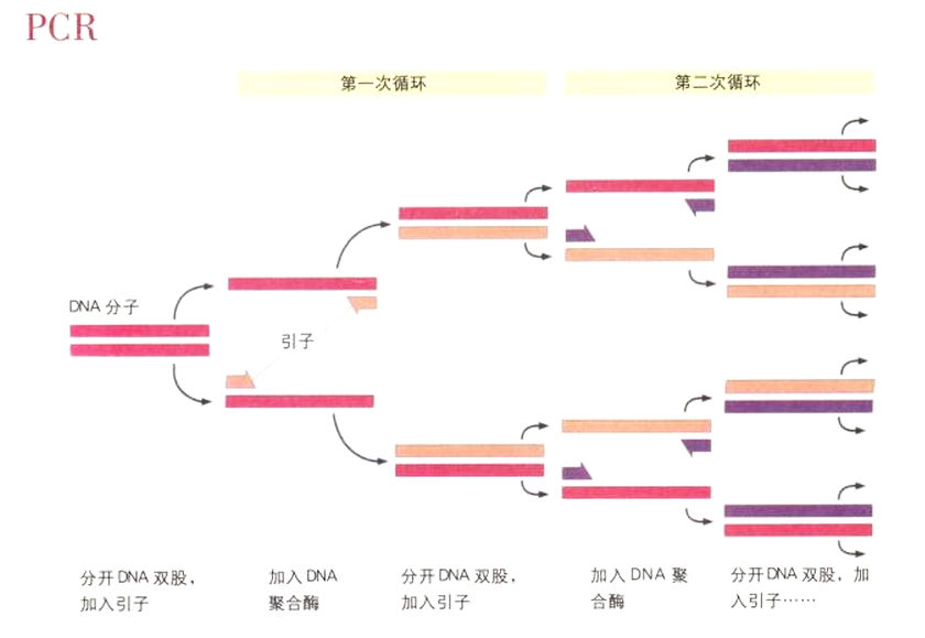 聚合酶连锁反应是极为简单的过程。第一步是以化学方法合成两个引子(primer),所谓“引子”是短链的单股DNA,长度通常在20个碱基对左右。这两个引子和目标DNA片段的两端具有互补的序列,它们就像是把我们想要的基因用括号括出来。我们首先从组织样本中萃取出作为模板的DNA,然后加入引子。这个模板实际包含整个基因组,而我们的目标是大量扩增想要的目标区。在加热到摄氏95度时,DNA的双股会分开。这让每个引子得以和20个碱基对的模板片段产生互补结合,在两条单股的模板DNA的一端,便会形成具有20个碱基对的双股DNA“小岛”。DNA聚合酶(这种酶能把新的碱基对合并至单股DNA上的互补位置,借此复制出DNA)只有在DNA已经是双股的位点上才会开始作用。因此,DNA聚合酶会从引子和模板片段互补结合后所形成的双股小岛启动,由每个引子开始制造与模板DNA互补的股,从而复制出目标片段。等这个过程结束时,目标DNA的总数会增加一倍。接着我们可以重复加热步骤,整个过程再来一遍:由两个引子标示出的DNA片段的复本再度倍增。这个过程每循环一次,目标片段的数目就会倍增。经过25次循环后,亦即在不到两小时内,目标DNA的数量便扩增225倍(约3400万倍)。事实上,最初由模板DNA,引子,DNA聚合酶和自由的A,T,G,C所构成的混合溶液,最后会变成目标DNA片段的浓缩溶液。