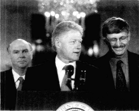 2000年6月26日终于来临。克林顿在白宫,布莱尔在唐宁街10号首相官邸同时宣布,人类基因组计划完成第一份草图。这场竞赛以平手收场,双方共享荣耀。至少在这天早上,对阵双方都把敌对情绪抛在脑后。克林顿宣称:“今日,我们学习上帝创造生命的语言。在获得这个深奥的新知识后,人类即将获得全新、庞大的治疗疾病的力量。”伟大的时刻搭配伟大的言辞。在面对这个被媒体喻为和阿波罗号首度登陆月球一样伟大的成就时,很难不感到光荣,即便这次成功的“官方”日期定得有点武断。其实这时定序工作根本还没完成,而且一直要到6个多月以后,基因组的正式科学报告才会问世。有人便嘲讽说,这个宣布时机不是根据人类基因组计划的时程,而是根据克林顿和布莱尔的行程制订的。
