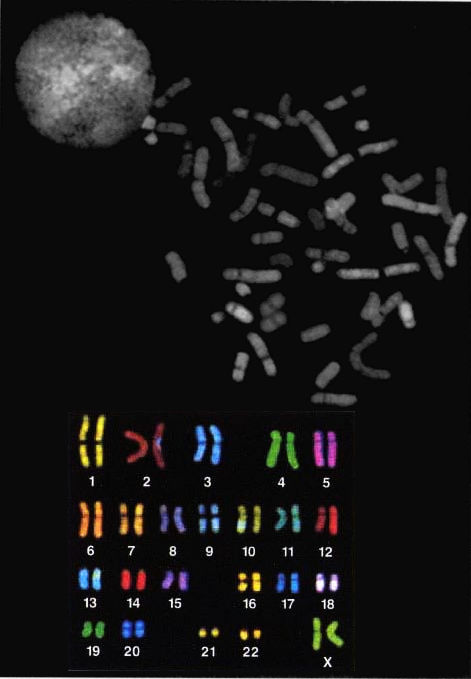 以染色体专用荧光着色剂上色的整套人类染色体。每个细胞里的染色体总数是46个——完整的两套,各从父方和母方得到一套。基因组是一套23个染色体,亦即23个很长的DNA分子。