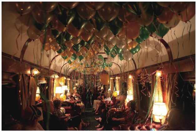 车内是奢靡的维多利亚风格的黄铜吊灯,古老的电扇在缓慢地转动着,天并不太热,旋转也不会搅起多少凉风,只为制造氛围。一套套烦琐餐具银光闪亮,红酒的琥珀色涟漪在水晶杯内跳荡,烤牛排的脂肪和黄油的焦香气、点心的碳水化合物的烘焙之香、牛奶和各种珍稀水果的香甜黏腻气味……交织在一起,变成味觉、嗅觉与视觉的盛宴。