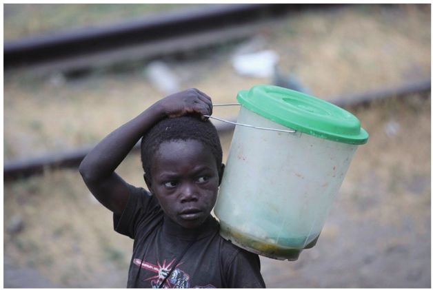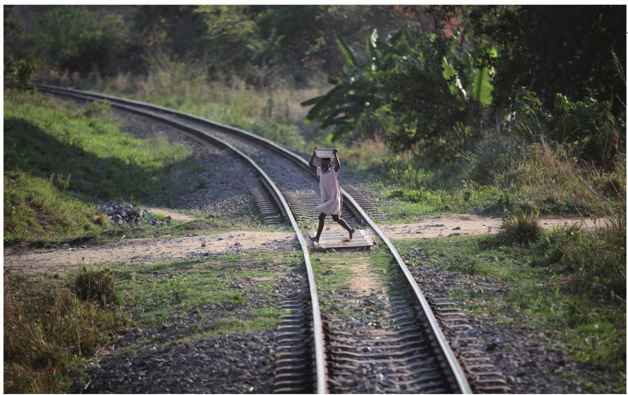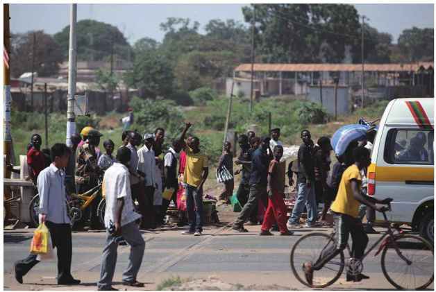 火车路基通常较高,两侧有排水沟,然后是高高的护岸。按说在餐车里进食,外人是看不到列车内部情况的。但有时的停靠地,护岸高企,几乎同列车车厢齐平。无数闻讯赶来看热闹的黑人群众蹲坐在路旁,用黑白分明的大眼珠子,目不转睛地盯着车厢看。