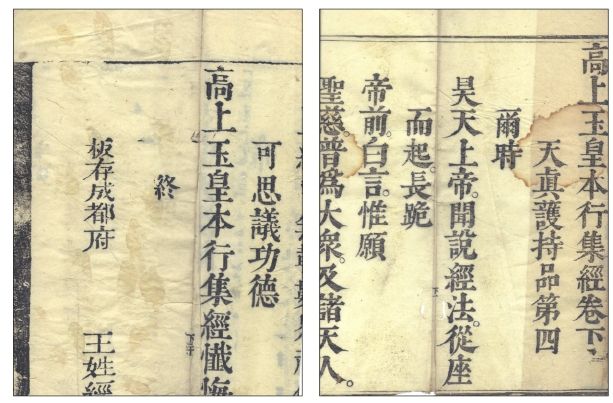 现在我们用的经书大部分是在青羊宫印的,那里还保留了版子,但雕版用久了,印刷质量也会一次不如一次。去二王庙学习高功的时候,大家都购买教材,也是在青羊宫印的,那次好像印了四十多套,完全供不应求,我去晚了一点,人家说早就被抢光了。师父那里有以前的经书,宣纸很薄,纸上还印了各种图案,有些实在太破旧,就要拿出来补,用相同颜色的宣纸一个字一个字地抄写,再贴上去。她有一套《高上玉皇本行集经》,分上下册,破损得非常严重,后来托专门做经书的人修补,也让我扫描了原文做留存。