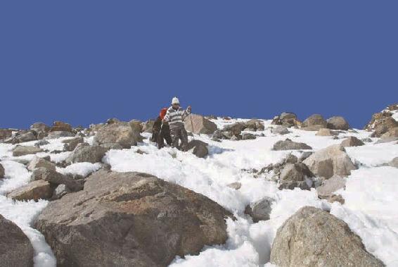 藏民说,从这里到卓玛拉山口都是冰雪,在冰上行走本来速度就慢,而且雪一般都有几尺,甚至1米厚,夹杂在乱石当中。如果我们不能在上午11点翻过山口,冰雪那时就化了,下山那段路根本走不了,上一脚是雪,下一脚是石头不说,很多地方看着是雪,踩上去就是个陷阱。