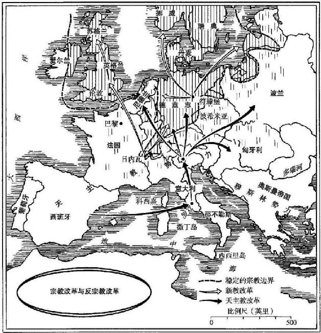 因此,新教运动没有变成德意志的,而是变成全欧洲的,特别是加尔文在日内瓦建立大本营(1541年)并使它成为活跃的宗教宣传中心之后。例如,英国于1534年宣布与教皇断绝关系,但是英国教会只在一定程度上变成了新教国家,而且主要受到来自日内瓦的刺激。与此同时,荷兰人和苏格兰人把加尔文教变成了占支配地位的教派。相反,在法国,政府仍然保持了天主教信仰。法国新教历经辉煌的开端后,1600年左右就失去了锐气。在意大利,新教从未得到广泛的支持,当被恢复的天主教势力变得明显时,它就萎缩了。另一方面,斯堪的纳维亚变成了路德派,与几乎一半德意志人一起。欧洲各地正在开始兴起的民族主义在决定各自宗教信仰方面发挥了重要作用。