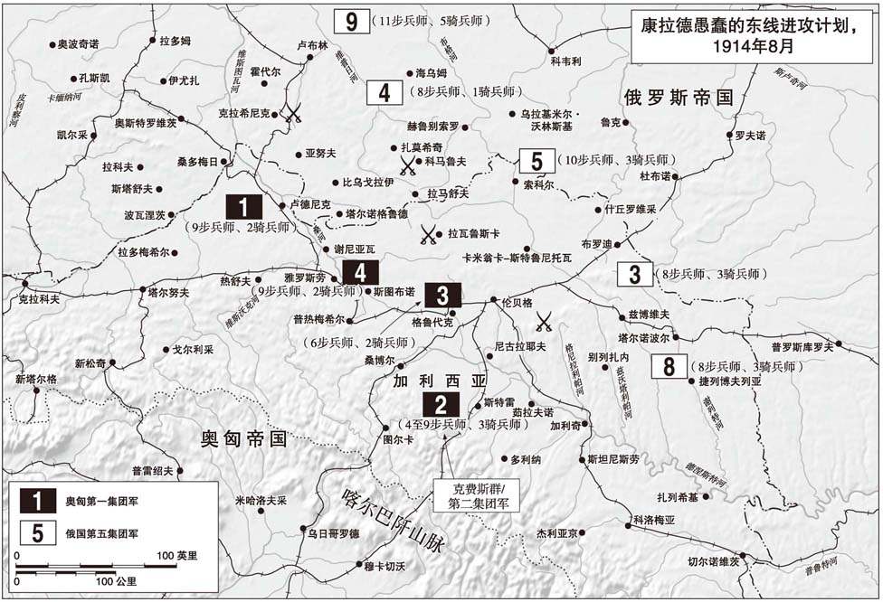 康拉德也发出同样的疑问:“接下来呢?”他一直夸称自己是英明果断的将材,但在奥匈帝国的东部战线,他一开始的兵力调度就乱无章法到无以复加的程度。他与德国人没什么联系,他不喜欢德国人,但德国人更不喜欢他。他对一事无成的塞尔维亚战役置之不理,而那场战役仍在消耗捉襟见肘的宝贵资源。波蒂奥雷克仍抓着两个弱集团军不放——用来保卫奥匈帝国疆土绰绰有余,但用来再次入侵塞尔维亚则兵力不足。就东部战线来说,德、奥已在战前谈到从北、南两线分别出击(德国人从东普鲁士,奥地利人从加利西亚),夺取从俄罗斯帝国本体往西突出的俄属波兰。他们甚至谈到使波兰、乌克兰脱离俄国,将它们合组为一个由奥地利人治理、位于俄国与西方之间的缓冲国,为这场战役画下句点。[1]但说到入侵俄国,康拉德需要动用他的全部兵力,需要陈兵于俄国边境。结果他却把他已遭削弱的兵力部署在他战区最东边铁道卸除点以西约一百六十公里处,希望借此为击败塞尔维亚多争取一些时间。