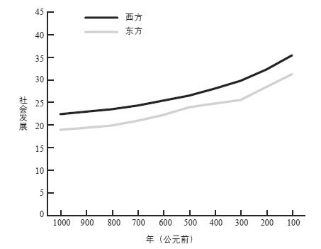 但是图5-1期间发生的事也非常重要。在公元前1000~前100年间,东西方社会发展指数几乎都翻了一倍。西方社会发展指数超过了35分,尤利乌斯·恺撒跨过卢比肯河时的分数要比哥伦布穿越大西洋时的还要高。